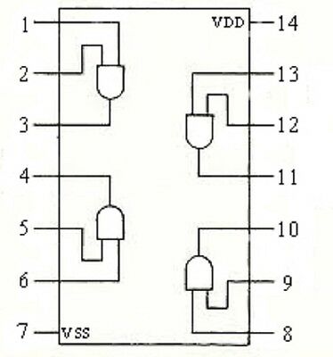 К1561ЛИ2 pinoutК1561ЛИ2 - USSR CMOS integral circuit, which contains quad two-input AND gates. Package type 201.14-1, max. weight 1 g.